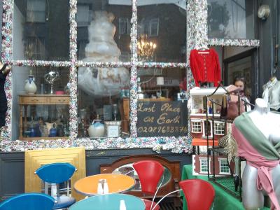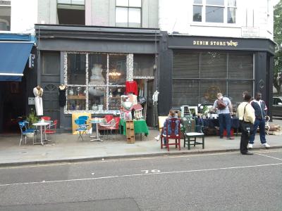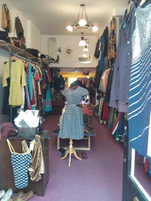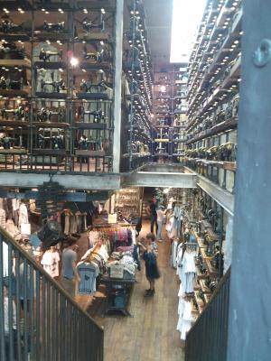 die gesamten Schaufenster sind mit Nähmaschienen dekoriert. Im Untergeschoss wird gefertigt und oben verkauft
